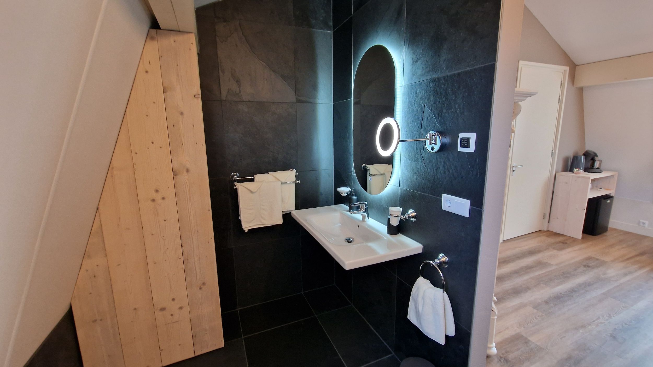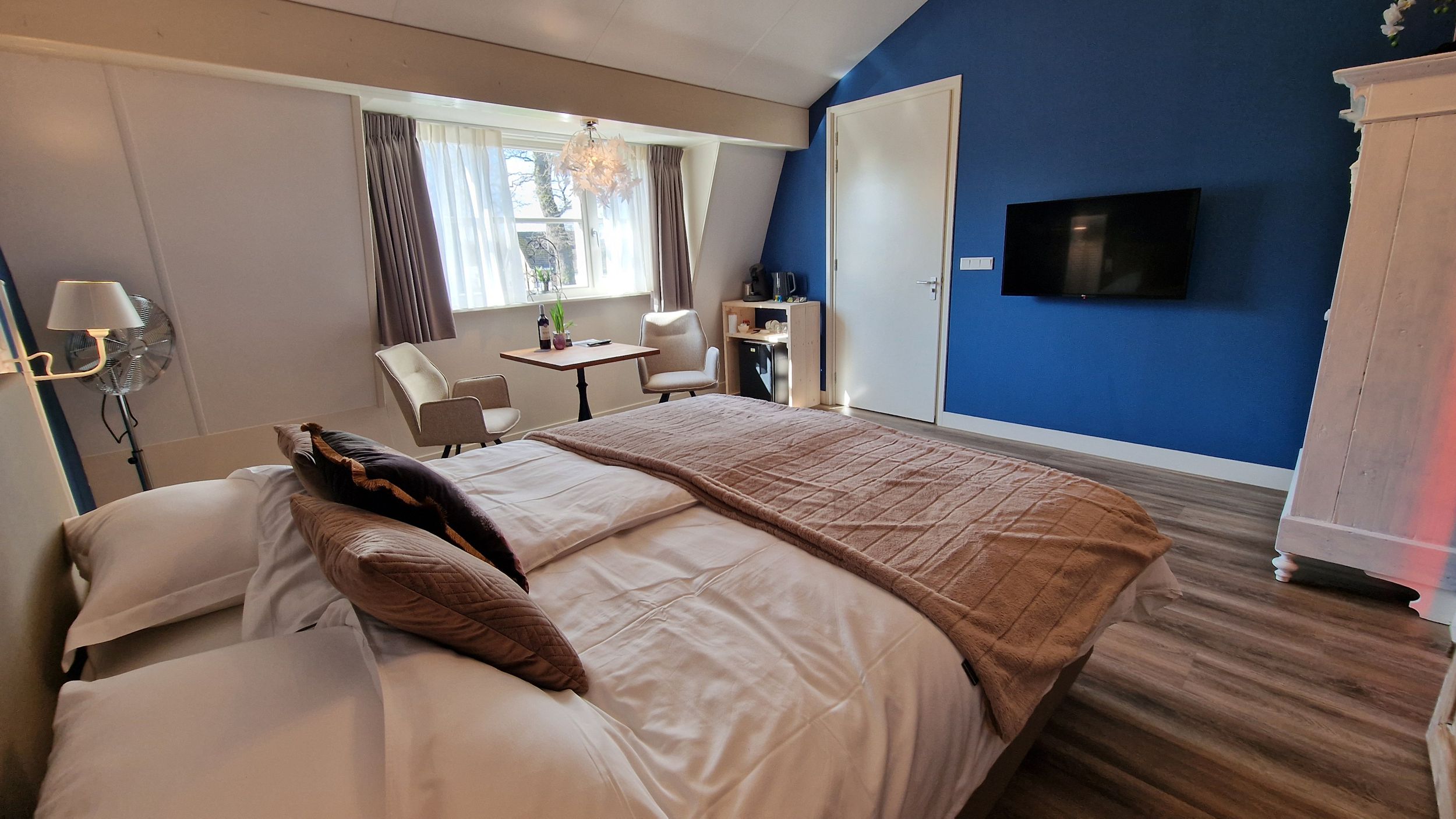 Verder beschikt deze kamer over een sfeer gashaard, plasma tv, gevulde mini-bar (wijn, fris, bier), föhn, kluisje, koffie, thee en gratis WiFi. Deze kamer is met de trap bereikbaar, er is geen lift aanwezig.